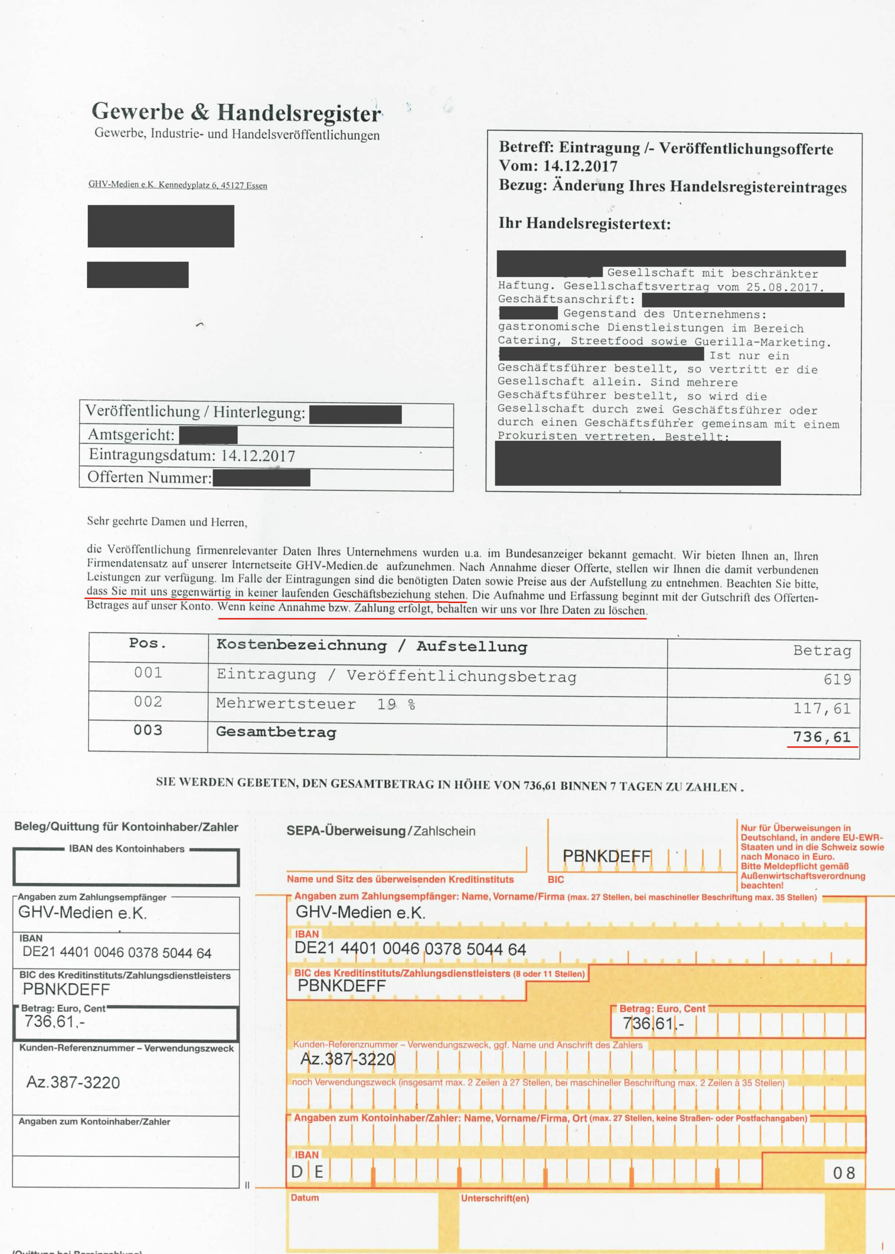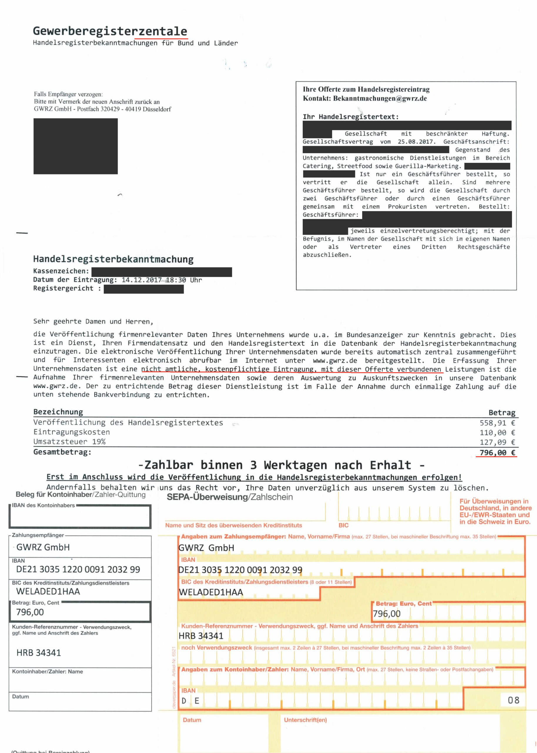 - Wir hören immer wieder von befreundeten Unternehmen und selbstständigen, dass sie verdächtige Post bekommen, die sich als Rechnungen des Handelsregister ausgeben.